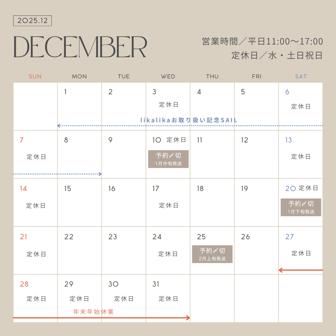 ご予約は 12/20(土)23:59 に締切後、メーカーへ発注します。発注から 4週間前後 で商品が入荷し、検品後すぐに発送いたします。(※目安になります。)