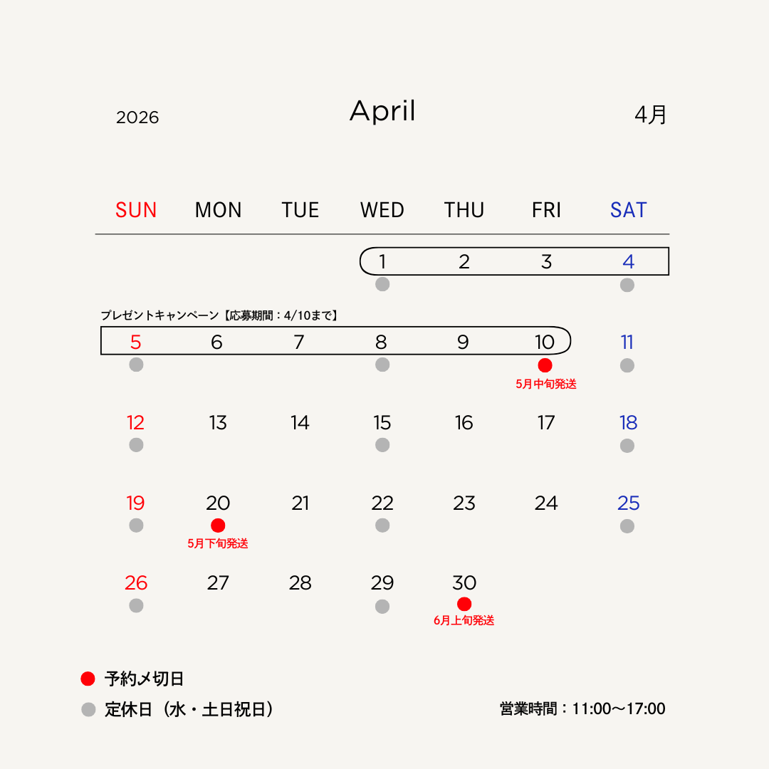 ご予約は4/10(金)23:59 に締切後、メーカーへ発注します。発注から 4週間前後 で商品が入荷し、検品後すぐに発送いたします。(※目安になります。)
