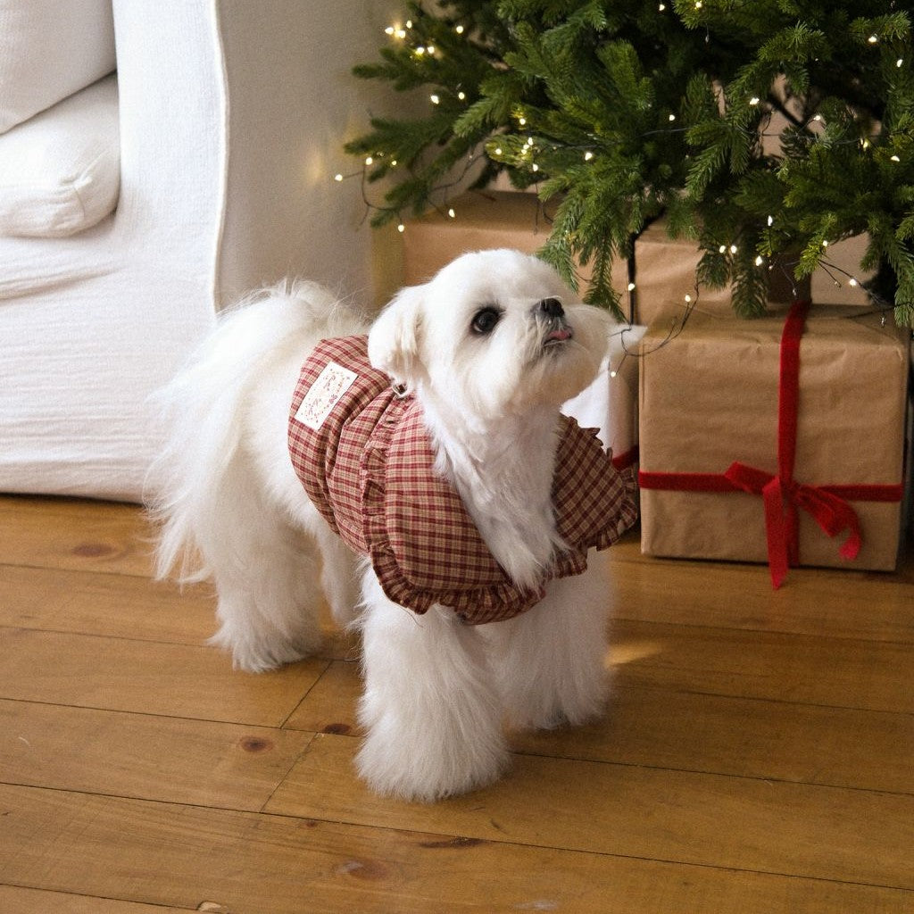 ヴィンテージ感のあるチェック柄と、ボリュームのあるフリルカラーがクラシカルな冬のムードを演出。