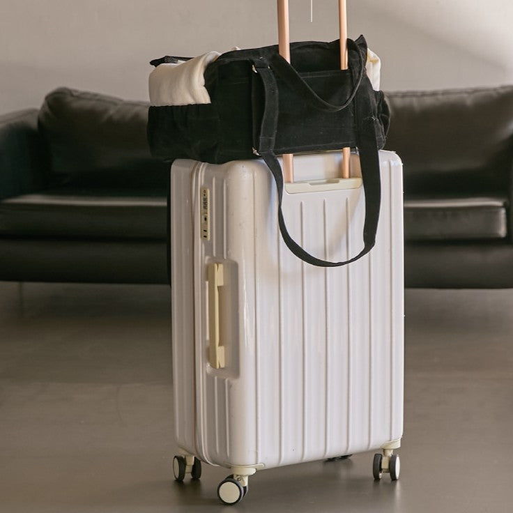 ②旅行の際には、キャリーケースの持ち手を通せるポケットがあり乗せて移動できます。