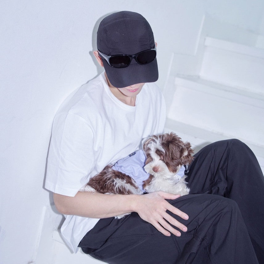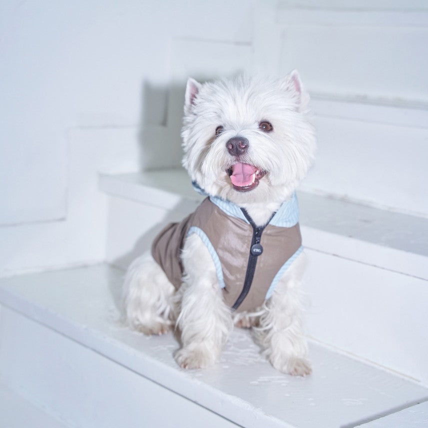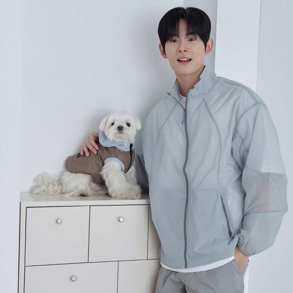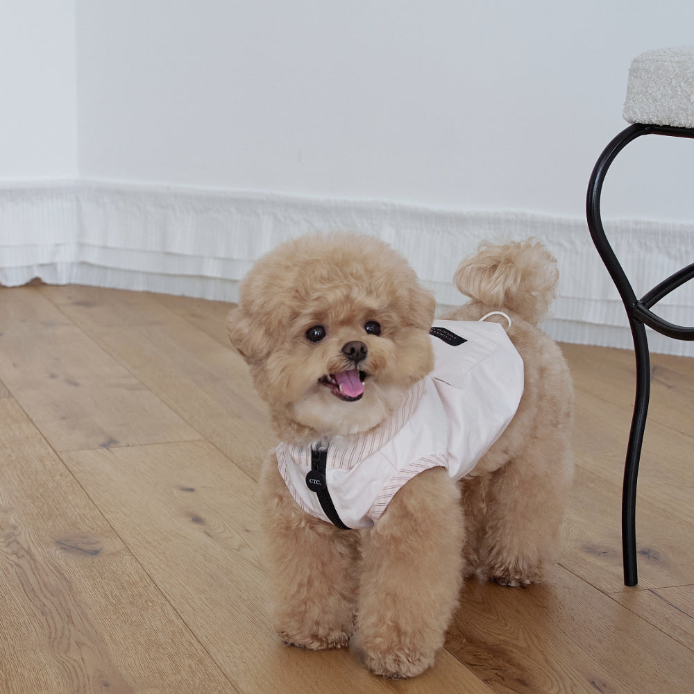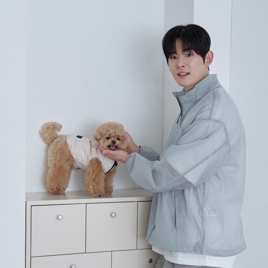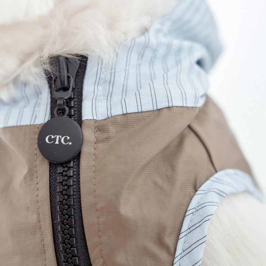 ジャケット背面中央にはリードを装着できるDリングを配置し、フードが顔にかからないよう固定できるスナップボタンも備えています。