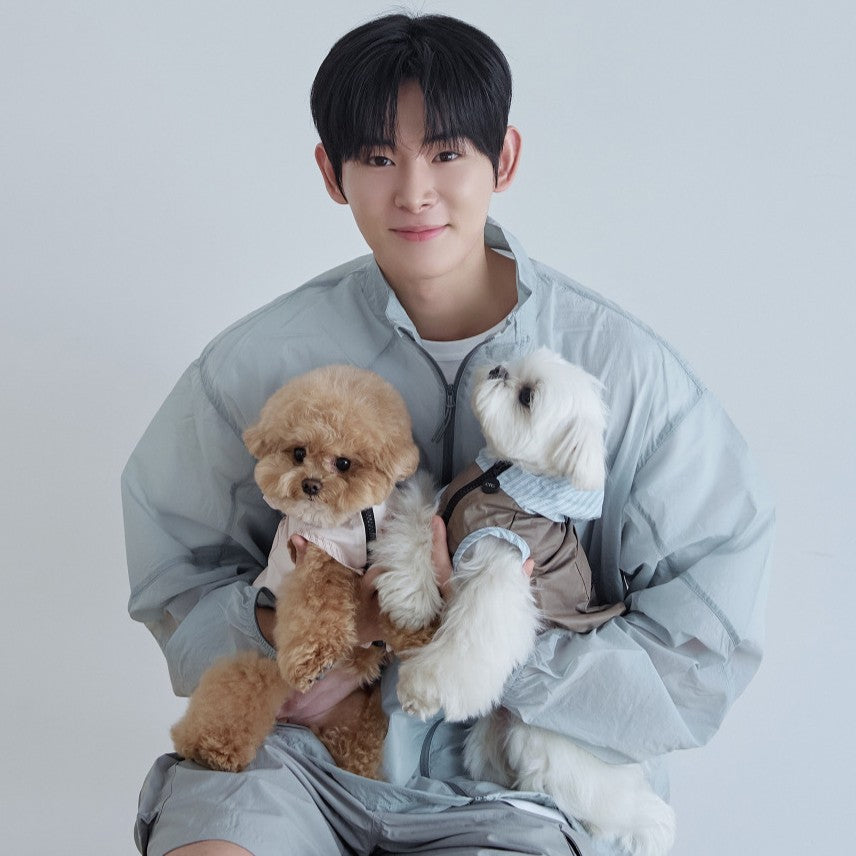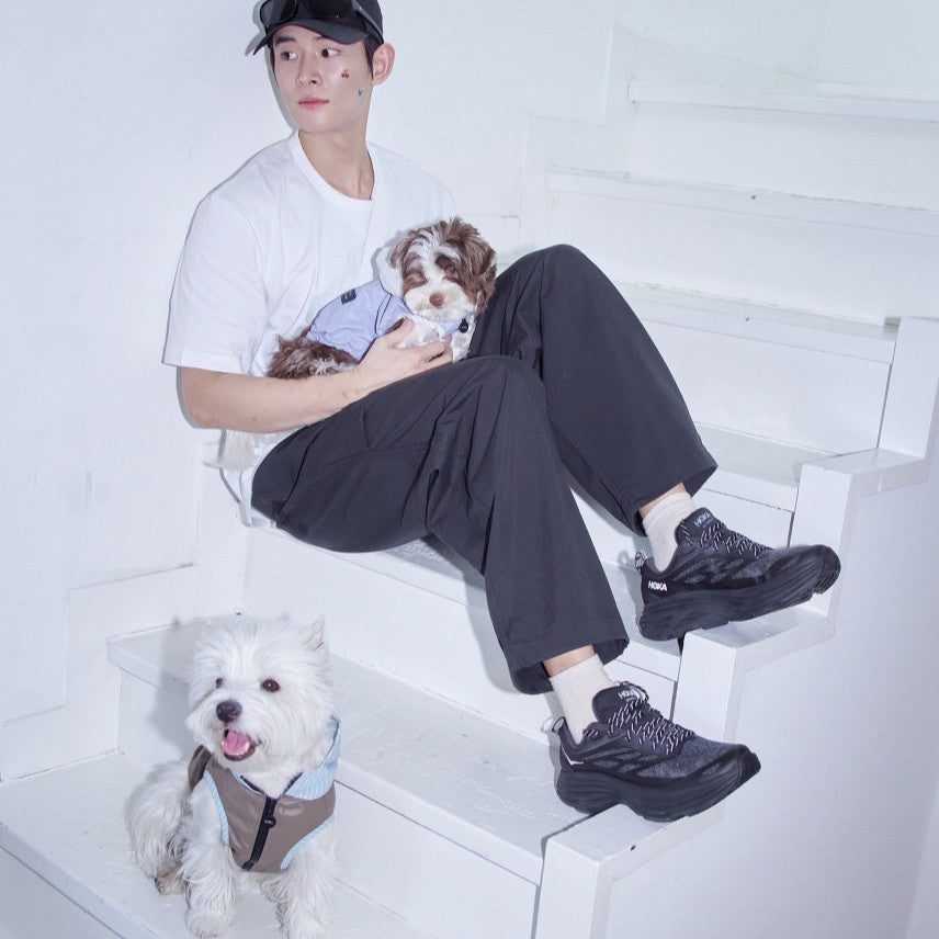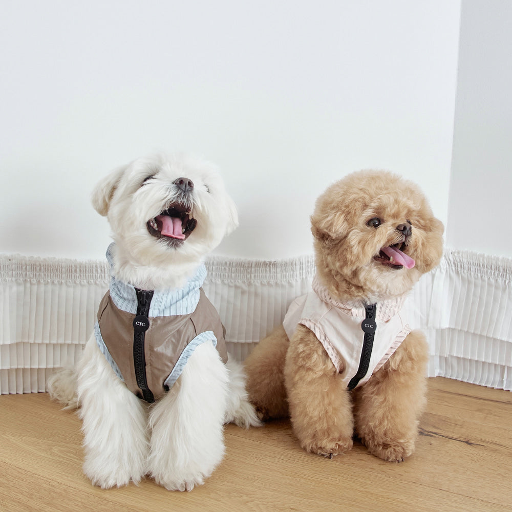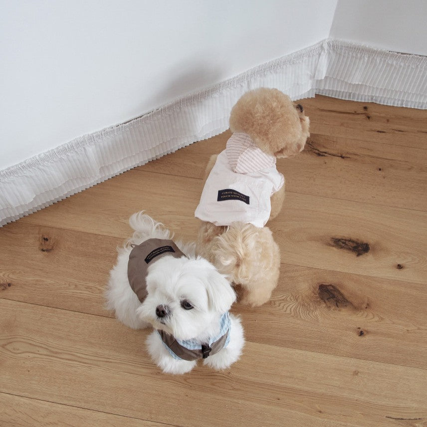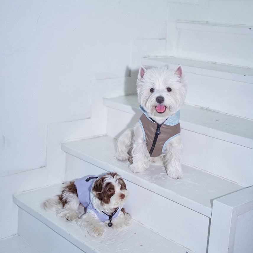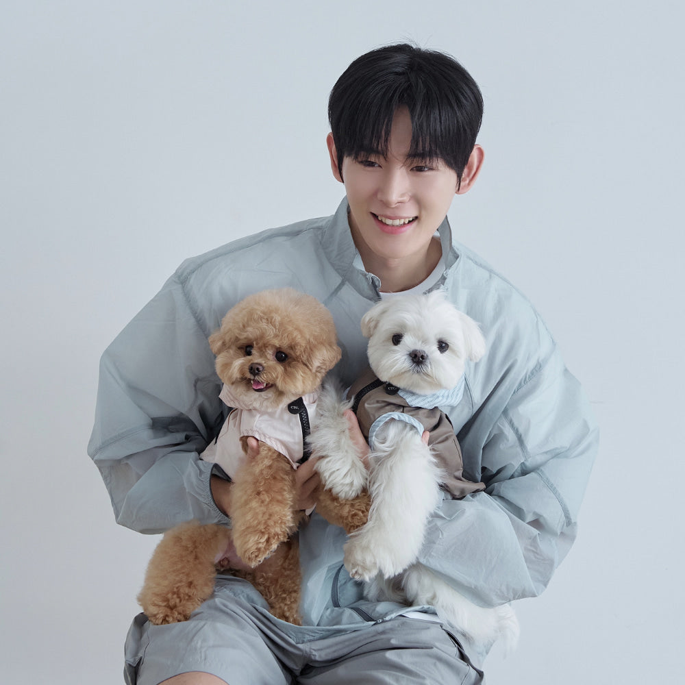 ジャケット背面中央にはリードを装着できるDリングを配置し、フードが顔にかからないよう固定できるスナップボタンも備えています。