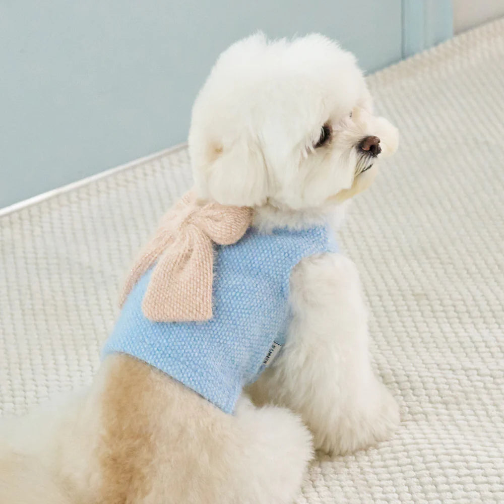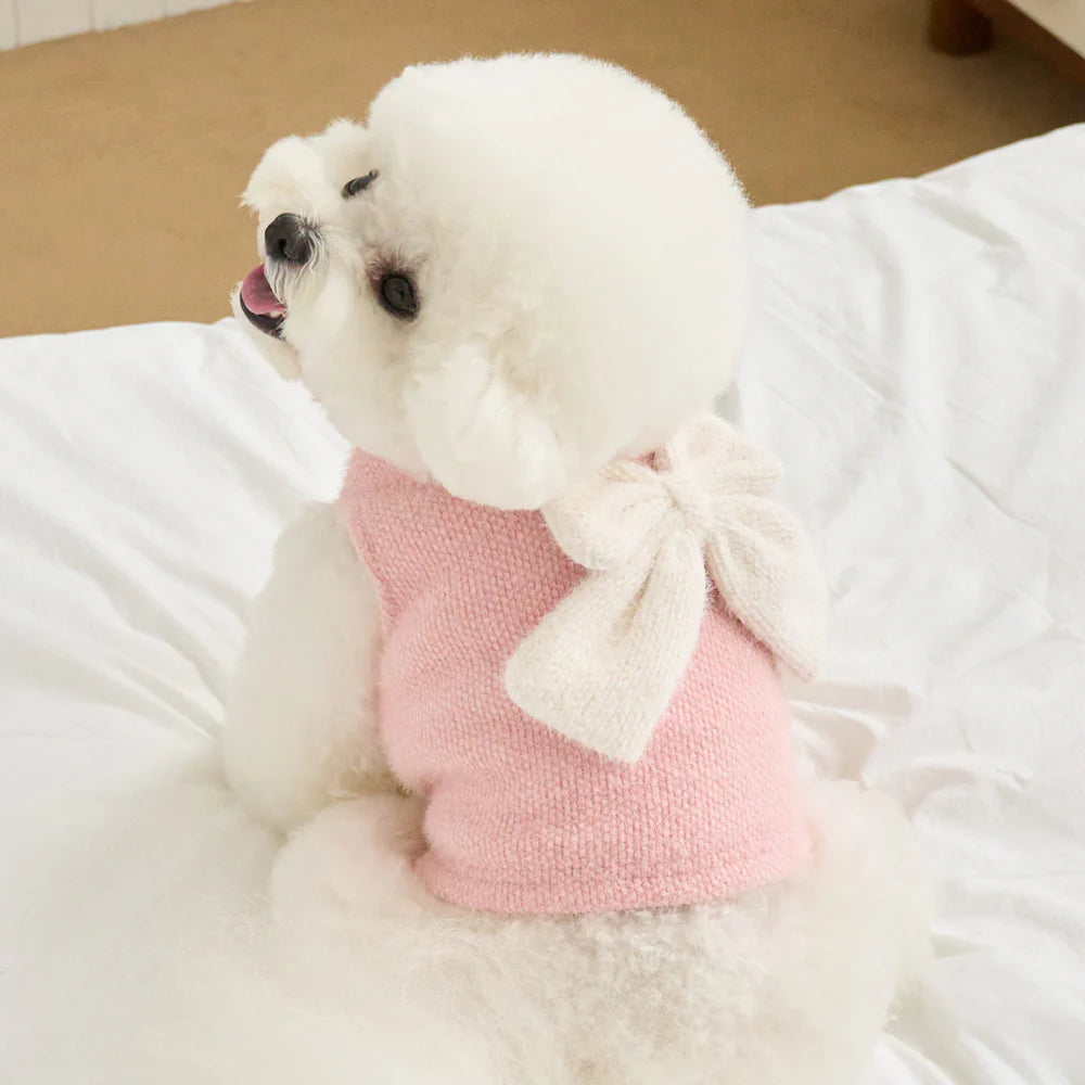 きらめく高級感のあるツイード素材にビッグリボンのポイントが視線を集めるニット。