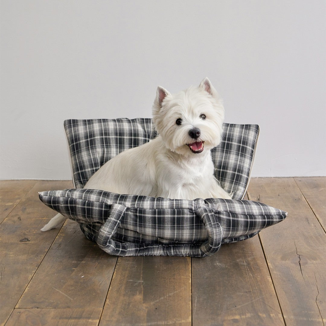 側面ファスナーを開くとクッションのように広く使用できます。お出かけするときはキャリーバッグとして。外出先やおうち時間ではクッションとしてお使いいただけます。