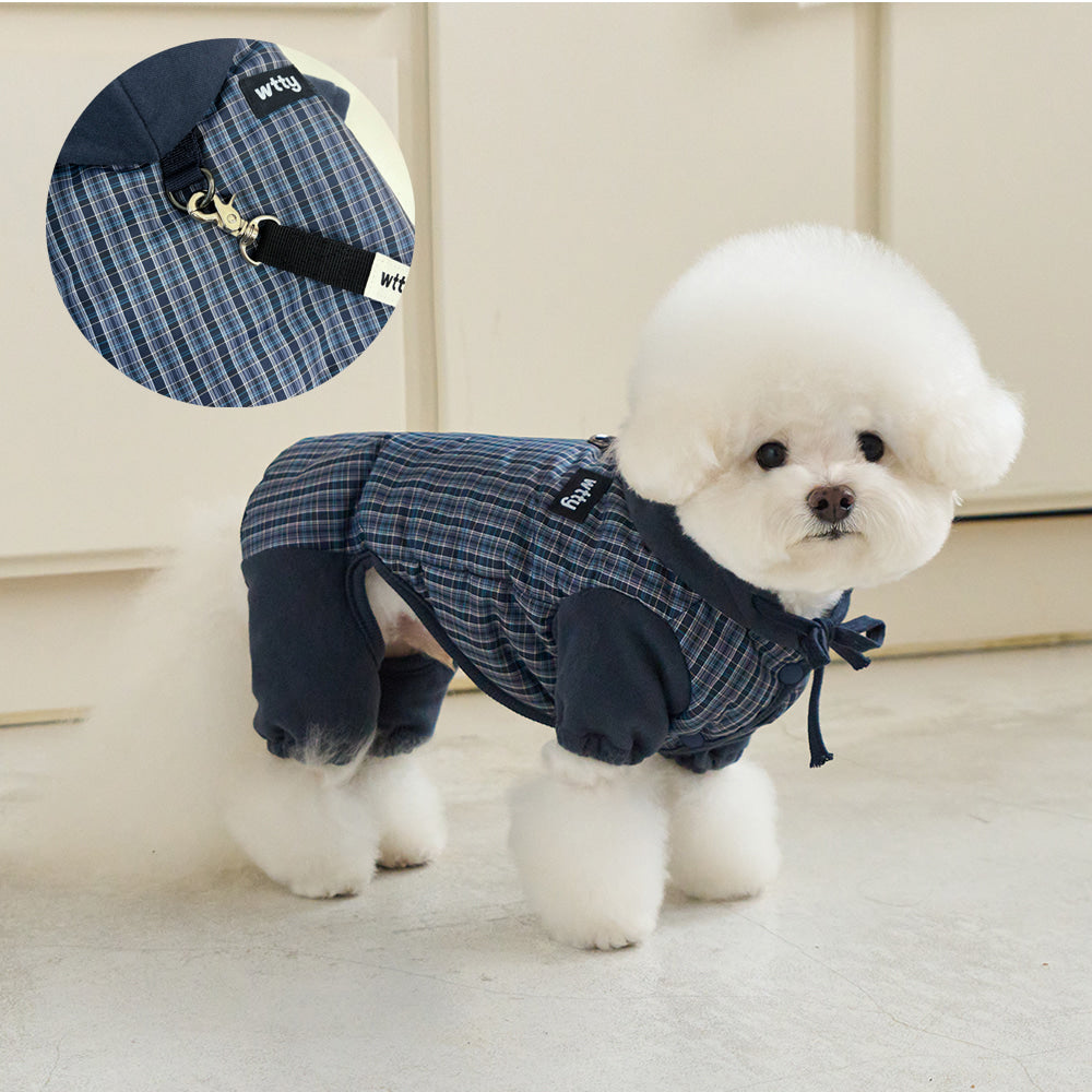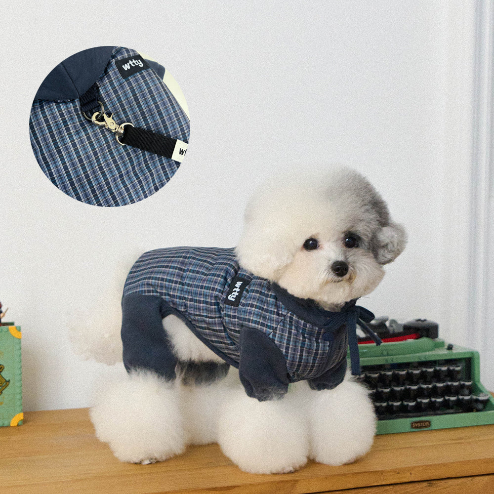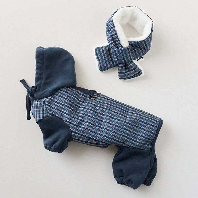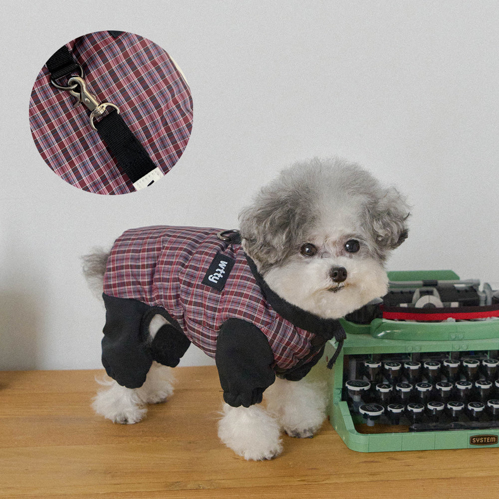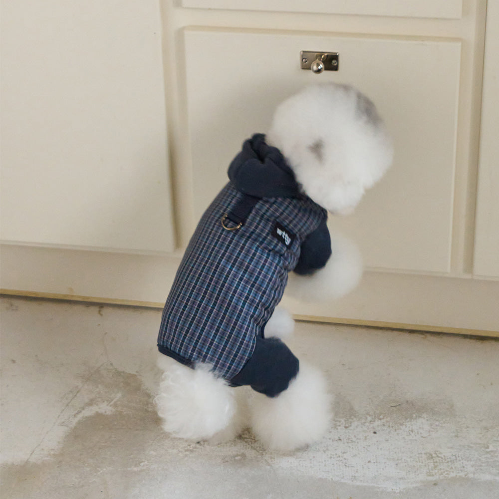 トレンディなミックスカラーのチェックパターンが魅力的なオールインワン。 パンツの裾はゴム仕様になっており、冷たい風から愛犬をしっかり守ります。 フードはスナップボタンで固定できるため、お散歩中に前へずり落ちてくる心配もありません。