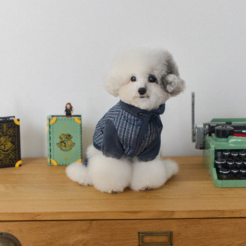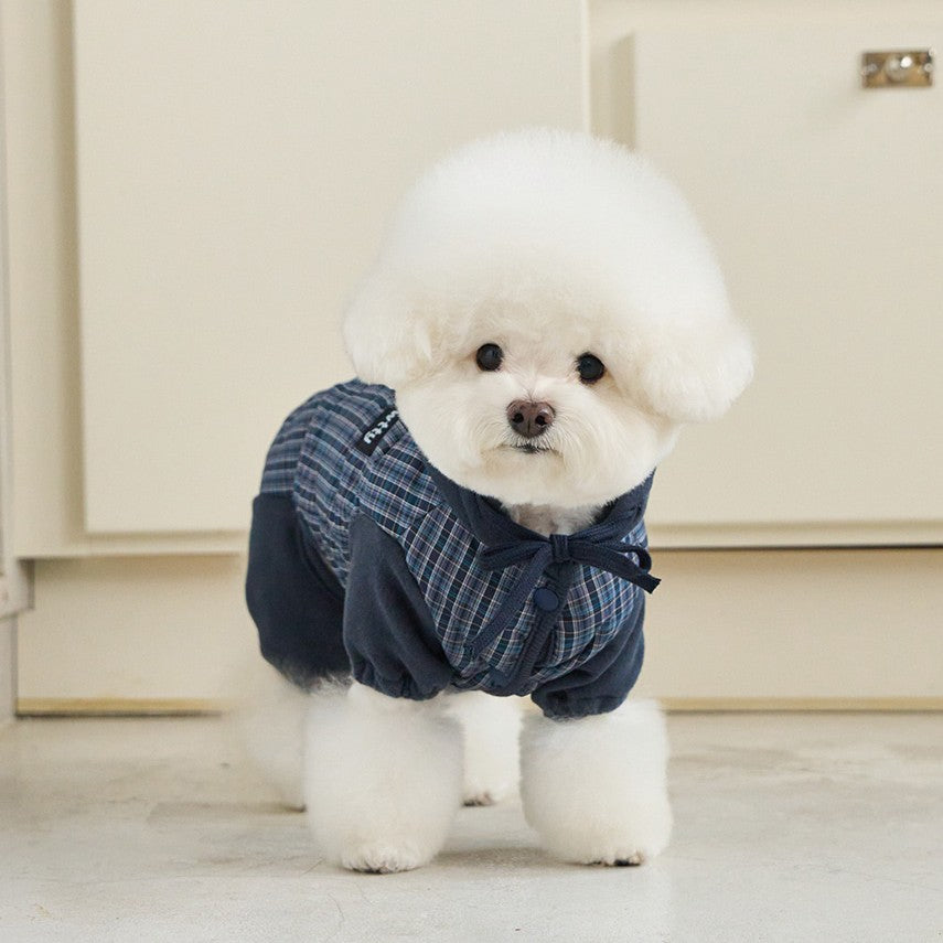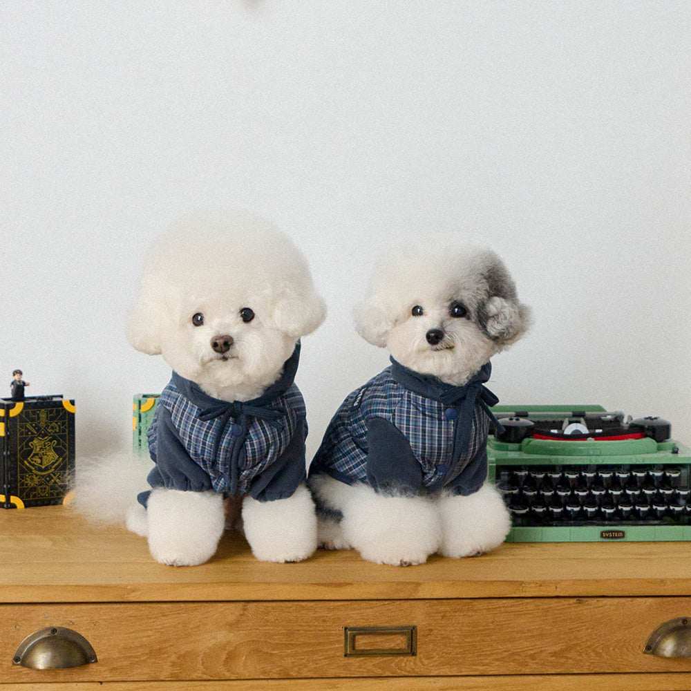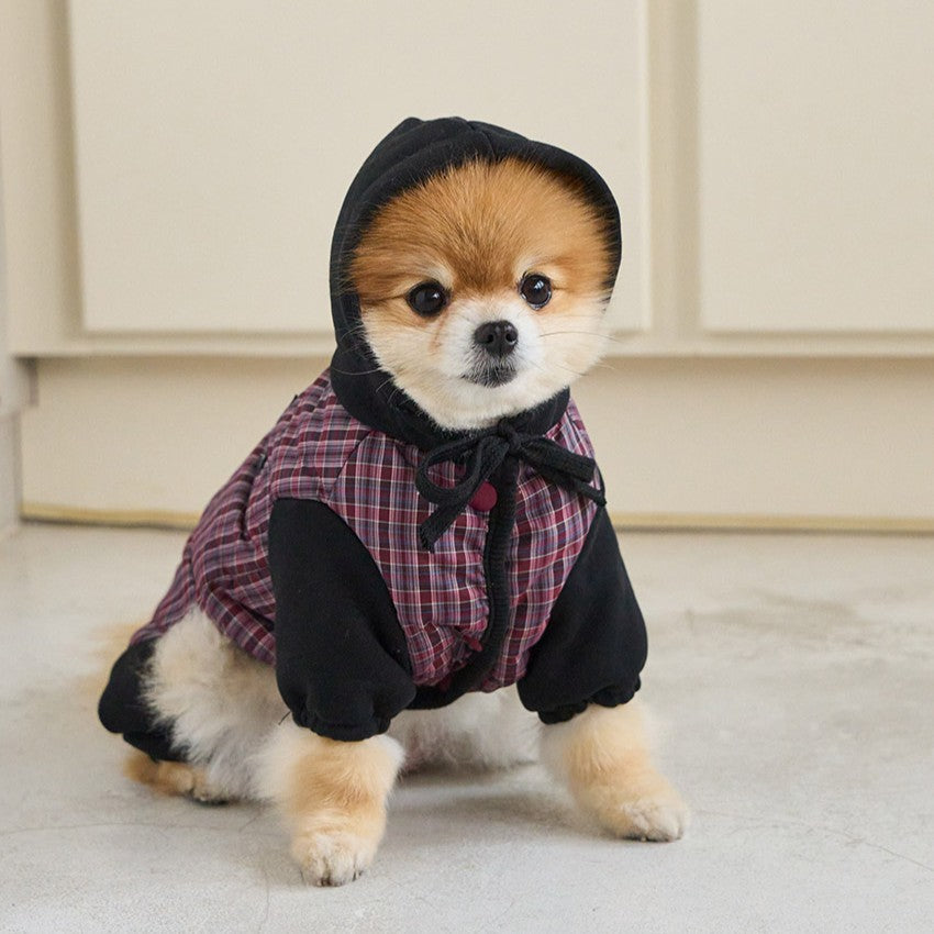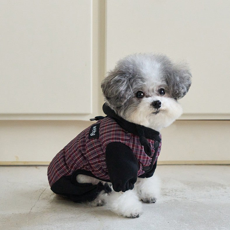 トレンディなミックスカラーのチェックパターンが魅力的なオールインワン。 パンツの裾はゴム仕様になっており、冷たい風から愛犬をしっかり守ります。 フードはスナップボタンで固定できるため、お散歩中に前へずり落ちてくる心配もありません。